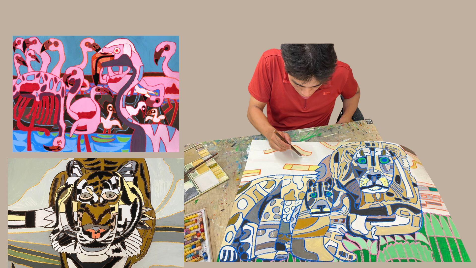 彼の頭の中には常にワンダフルで笑顔があふれる世界が広がっています。近年、色彩により興味を持ち、色の世界へ吸い込まれるように集中し、下書きなしで、迷いなくクレパスでキャンバスに思いを込めるそのスタイルは、彼の絵への直感的なアプローチを物語っています。